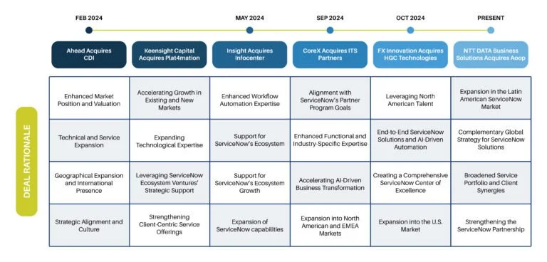 Here is a summary of the ServiceNow M&A transactions that have occurred thus far in 2024. The main M&A motivators for these deals are also noted.